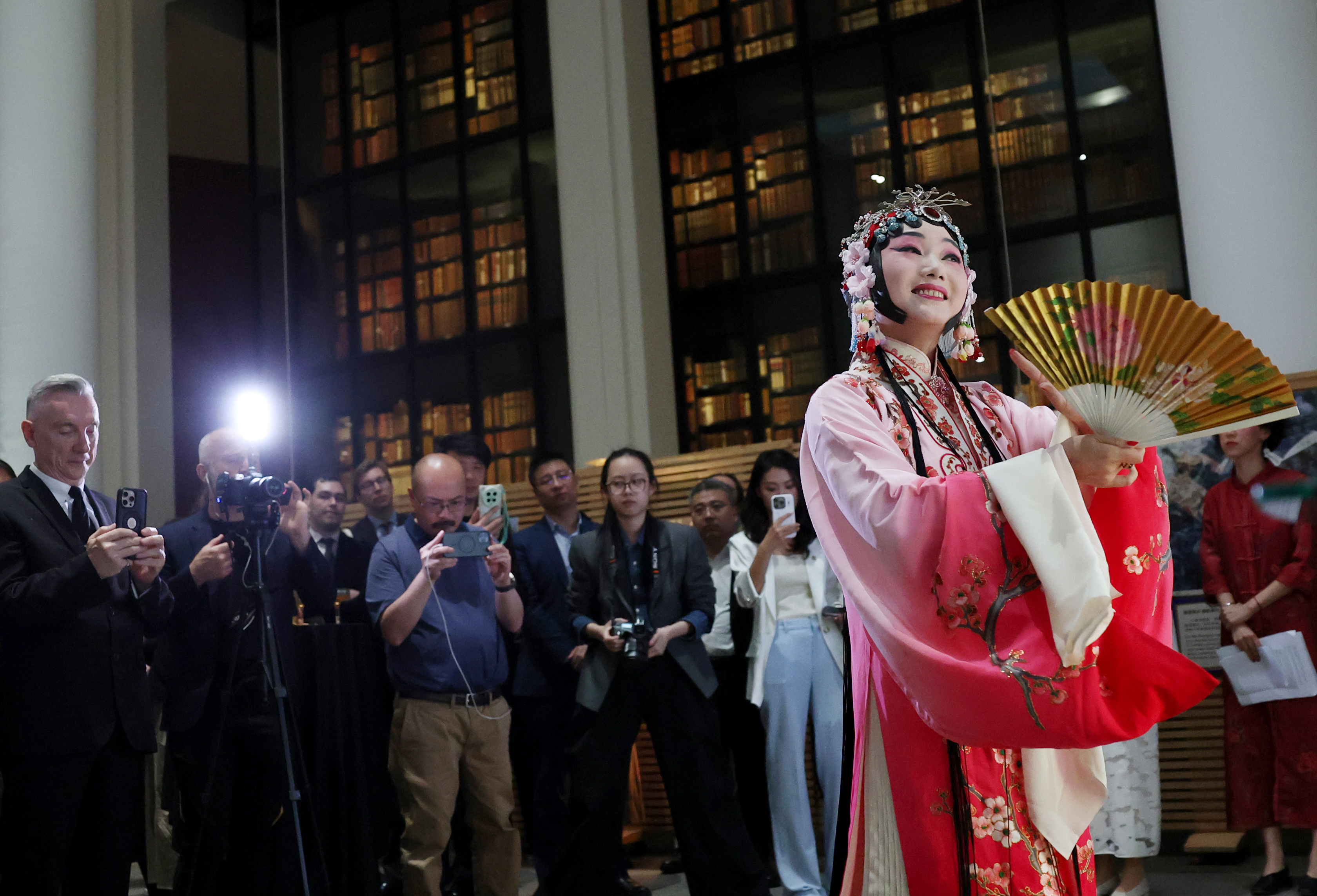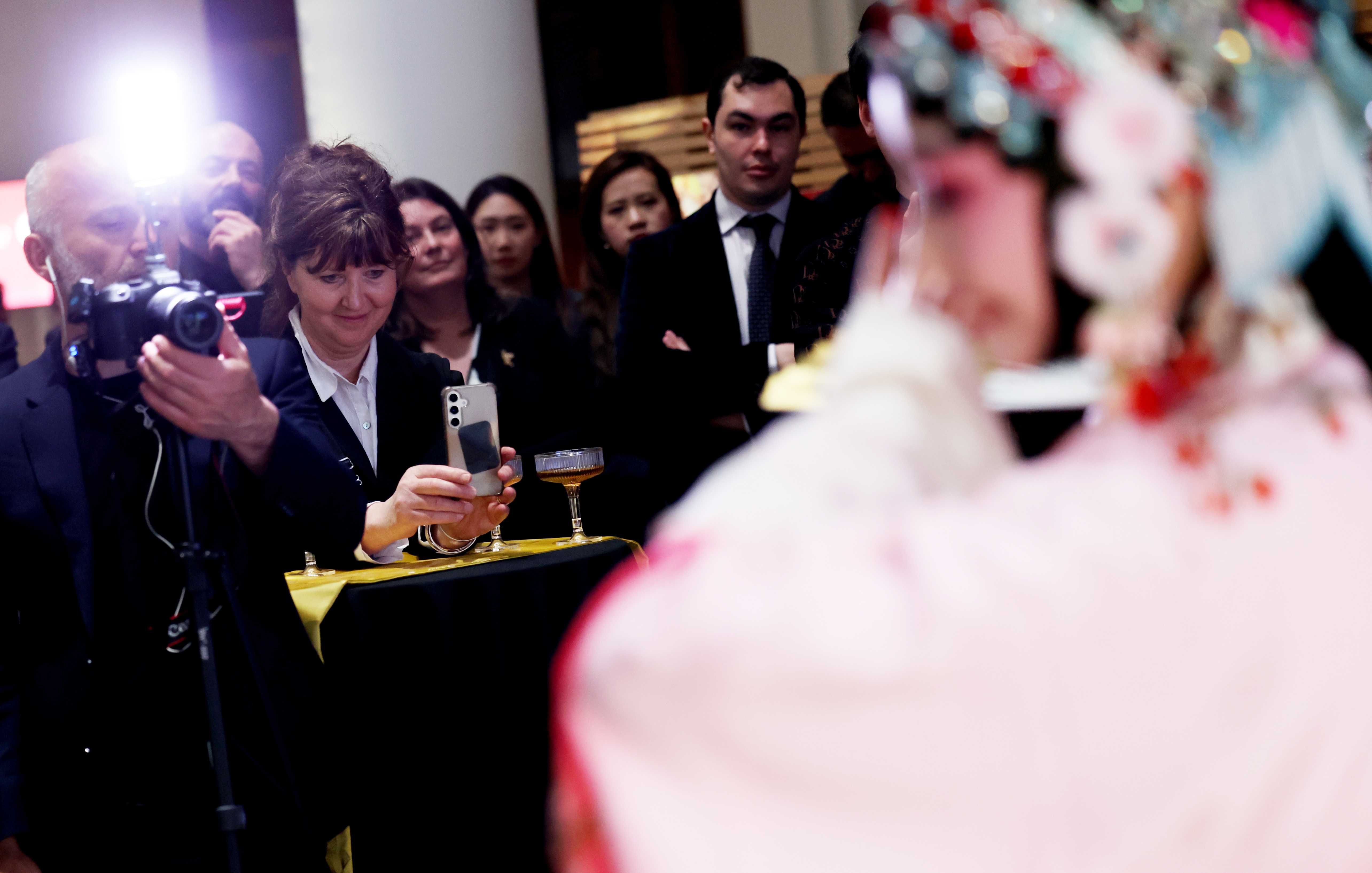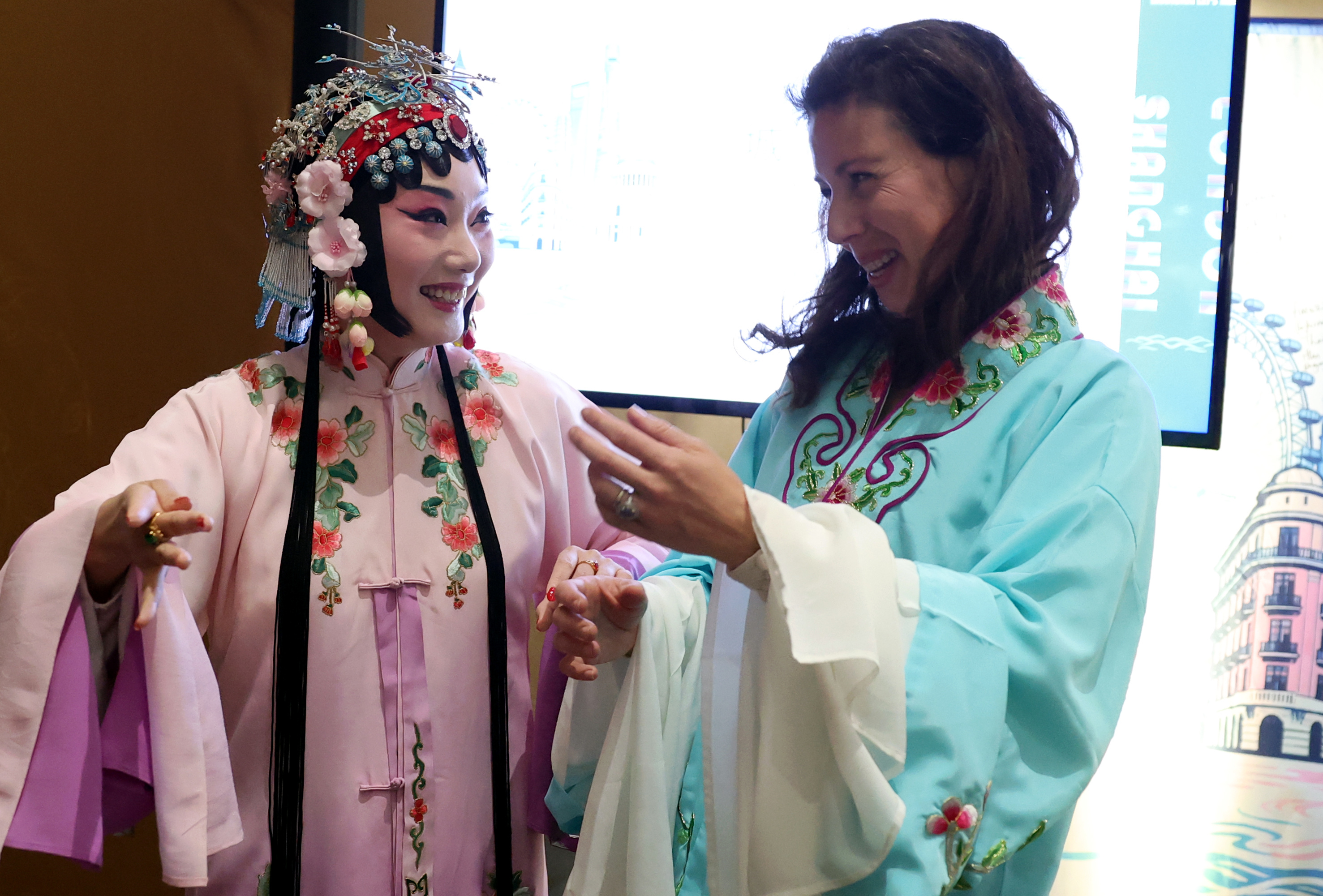 4月24日,在英国伦敦举行的“城市茶客厅”暨“魅力上海”城市形象推广活动上,一名女子与昆曲演员互动。新华社记者 李颖 摄