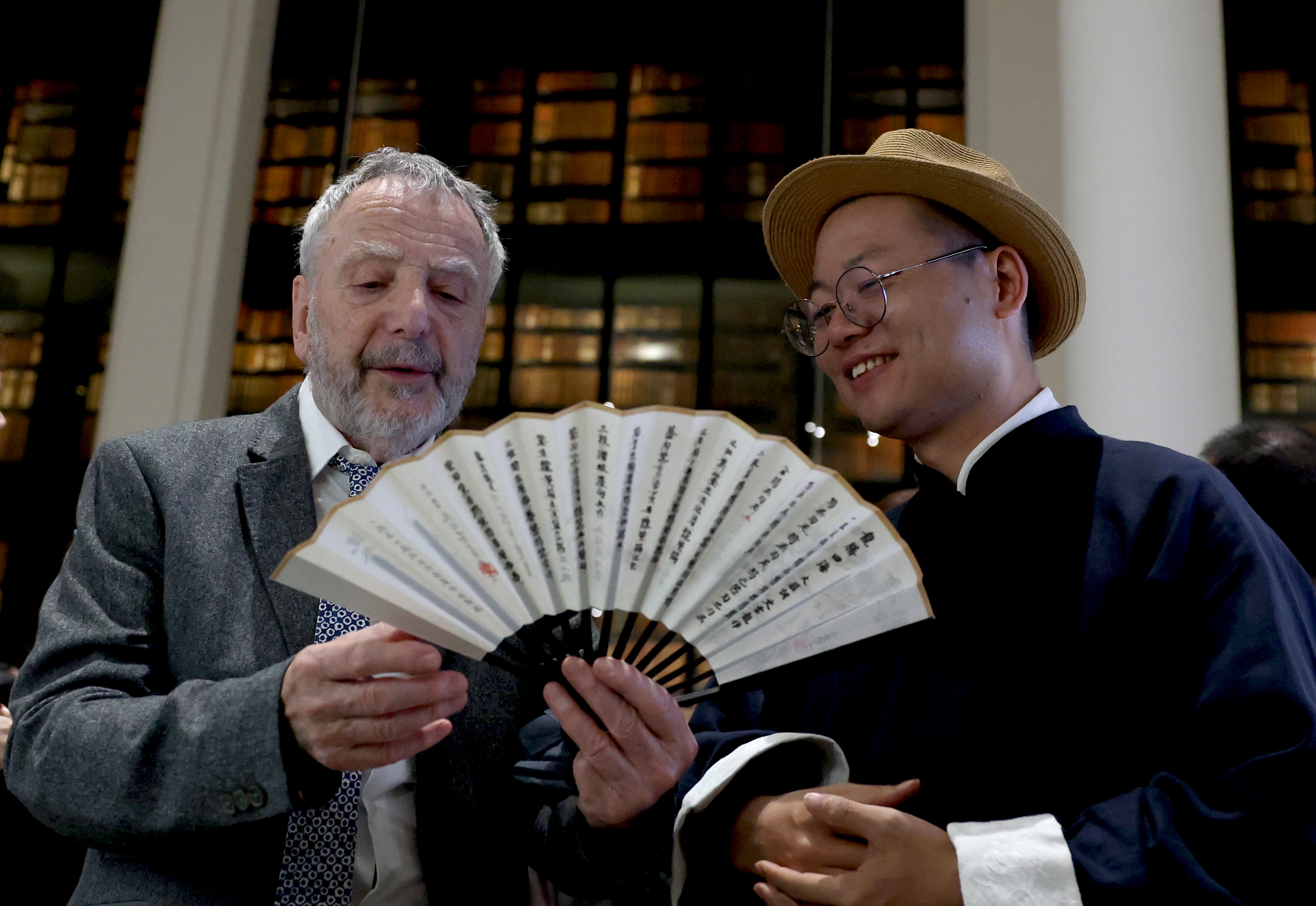4月24日,在英国伦敦举行的“城市茶客厅”暨“魅力上海”城市形象推广活动上,一名男子欣赏传统中国折扇。新华社记者 李颖 摄